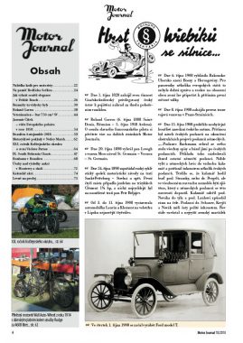Motor Journal číslo 10 vychází v pátek 5. října. Na vychutnání báječných zážitků z letošního ročníku Kolštejnského okruhu nebyl v redakci čas, protože poslední prodloužený víkend měsíce září diktoval jasně: Soběšice. Ale opět se zdařilo dodat v termínu podklady do tiskárny, aby čtenáři mohli konzumovat informace. Už titulní strana naznačuje zajímavý článek o účasti v nadnárodní soutěži elegance. Události v datech, osobnosti, závody, novinky na výstavách, to vše v politických souvislostech – to je obsah rychlého „průletu“ minulostí. Fundovaný historik dostal celou stránku pro Poctu hořickým závodníkům a lidem. Dvoustrana knižních novinek decentně připomene, že již brzy vyvstane problém s volbou vánočního dárku. Na paměť Bedřicha Soffera byla připravena dvoustrana vzpomínek. Jak vyhrát soutěž elegance, se svěřil našemu redaktorovi majitel vítězného automobilu. Francouzskou automobilovou výrobní značku s dlouholetou tradicí na našich silnicích připomene článek s fotografiemi Renaulty tu vždycky byly. Nikoli tenis, ale počátky letectví a automobilové historie jsou spojeny se jménem Roland Garros. Kapitoly tuzemské motocyklové historie připomene monografie Plochý dvouválec z Radlic Itar 750. Kdo byl Jaromír Čížek, je obsáhlá vzpomínka na vítěze Evropského poháru v roce 1958. Jaké technické klenoty byly vystaveny na letošním ročníku Beaulieu Autojumble, přiblíží další stránky. Na přelomu letošního srpna a září přijely tisíce lidí, aby prodávali, hledali, smlouvali a kupovali Motocyklové poklady v Netley March. Subjektivní pohled přiblíží letošní XXI. ročník Kolštejnského okruhu o cenu Václava Paruse. Jižní Čechy jsou známy nejenom Křivonoskou, ale pevné místo v kalendáři má South Bohemia Classic. Nejenom automobily, ale i motorový člun byl v aukci Bonhams v Beaulieu. Celostránková pozvánka na motocyklovou aukci s několika motocykly vybízí k návštěvě ve Staffordu na sobotu 13. a neděli 14. října. V období, kdy probíhá soutěž elegance v Pebble Beach, se koná řada dalších motoristicky zajímavých akcí, což je shrnuto na dvoustraně Úvahy nad výsledky aukcí v Monterey a okolí. V inzertní části je výraznou grafikou připomenuta podzimní Motortechna. Poslední strana obálky už vybízí k záznamu do kalendáře 2019, kdy opět v červnu bude v prostorách brněnského výstaviště Brno Revival.