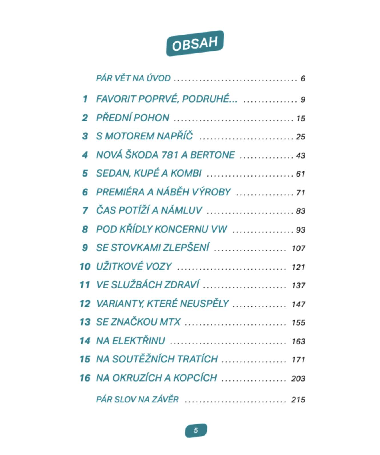 Kniha je především věnována vozu Favorit – prvnímu sériovému automobilu značky Škoda s pohonem předních kol, který mladoboleslavská automobilka vyvinula v úzké spolupráci s italskou karosářskou firmou Bertone a vývojovým střediskem firmy Porsche. Veřejnosti jej představila v září 1987 na strojírenském veletrhu v Brně.