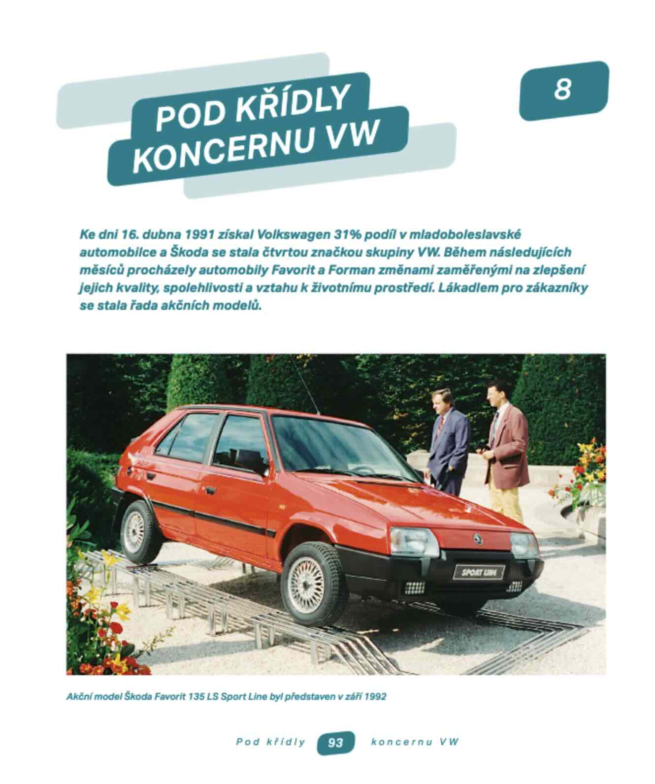 Publikace připomíná jeho poněkud komplikovaný vznik i úlohu v procesu novodobé emancipace mladoboleslavské automobilky, kdy se v dubnu 1991 stala čtvrtou značkou koncernu Volkswagen. Přehledně mapuje změny, jimiž prošly vozy Škoda Favorit, Forman a Pick-up během své aktivní kariéry v letech 1987 až 1995, a připomíná pestrou paletu jejich variant i projekty, které se do výroby nedostaly.