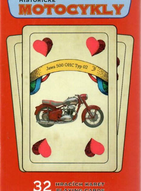 32 hracích karet s fotografiemi historických motocyklů.