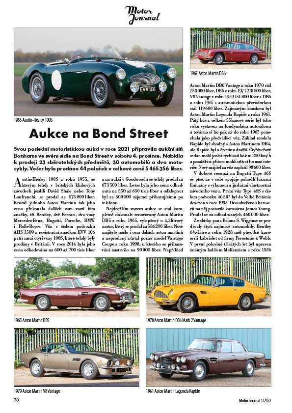 Lednový Motor Journal roku 2022 s pořadovým číslem 237, XXII. ročníku, vychází v pátek 7. ledna. Při dobré pozici v trafice bude titulní strana správně cílit na zvídavé zákazníky. Úvodník a dobová fotografie Zašlé časy navodí vhodnou atmosféru k ponoru do slibného obsahu. Detaily dějin Hrst hřebíků ze silnice začínají zprávou z Londýna, kde se 11. ledna 1902 konaly zkoušky automobilových brzd. O týden později už bylo možné si vyzvednout na sekretariátu rakouského autoklubu ve Vídni propozice a přihlášku k červnovému závodu Paříž–Vídeň. Data narození sportovců, konstruktérů, politických osobností, oběti motoristických podniků se střídají s termíny autosalonů, rekordními jízdami a nově patentovanými technickými novinkami. Postupně dojdeme až k současnosti, kdy nadchnou soutěžní vozidla účastníků Rallye Monte Carlo roku 1952. V témže roce řidička autobusu ČSAD ujela 54 260 km bez nehody, na Mezinárodní motocyklové soutěži v roce 1974 dosáhli naši reprezentanti cenných úspěchů – to je část z několika stránek historie s pozvánkou na Brno Revival festival rychlosti mezi pavilony na květnový víkend roku 2022. Dvě vzpomínky čtenáře jsou v rubrice Máte slovo. Aktuální prezentace knižních novinek předchází osobní vzpomínky na motocykl Velocette MSS. Novinkou zařazenou do hromadné dopravy v roce 1967 byly Karlštejnbusy – Vzhůru na hrad. Jméno takřka neznámé skrývá významnou osobnost, čtěte Adolf Raška. Trojnásobný mistr Evropy v automobilových soutěžích a nejúspěšnější polský závodník byl Sobiesław Zasada. Za dosaženými výsledky význačných osobností automobilových disciplín stál skromný Giulio Ramponi. Pokud se zdaří přehledně zpracovat životopis jednoho z mnoha vyrobených motocyklů, každý vyznavač jedné stopy si jej rád přečte – Orion F 58 A (1928). Po dvouletém omezení se nadšenci vydali na poznávací výlet k sousedům – čtěte Kolozvědná expedice I. Začátkem prosince už má pevný termín v kalendáři prodejní výstava v Norimberku, i letos akce proběhla v odlišných podmínkách – Retro Classic Bavaria 2021 výstava napadená covidem. Ještě se povozit, to byl záměr akce připravené na státní svátek v září pod názvem Přátelská vyjížďka motocyklů Mezi zámky. Aukční síň Bonhams připravila letošní poslední akci s motorovými vozidly – Aukce na Bond Street. Ve Francii proběhla dlouho očekávaná aukce letošního roku – Guikasova sbírka. Ještě knižní nabídka, drobná inzerce a vnitřní a vnější strany obálky s komerční inzercí – to je souhrnný obsah lednového výtisku.