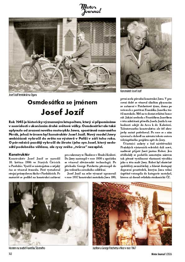 Rok 1945 je historicky významným letopočtem, který si připomínáme v souvislosti s ukončením druhé světové války. Osmdesát let ale také uplynulo od zrození nového motocyklu Jawa, spontánně nazvaného Pérák, jehož tvůrcem byl konstruktér Josef Jozíf. Nový model Jawy ambiciózně vykročil do světa na výstavě v Paříži v září toho roku. O pár měsíců později vykročil do života i jeho syn Josef, který nedosáhl podobného věhlasu, ale rysy svého „tvůrce“ nezapřel.