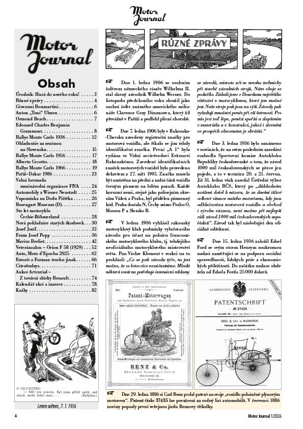 Tradičně se v rubrice Různé zprávy hlavně věnuje kulatým lednovým výročím s datem končícím pětkou. Připomínáme si osobnosti, závody, autosalony, novinky a nové knihy.