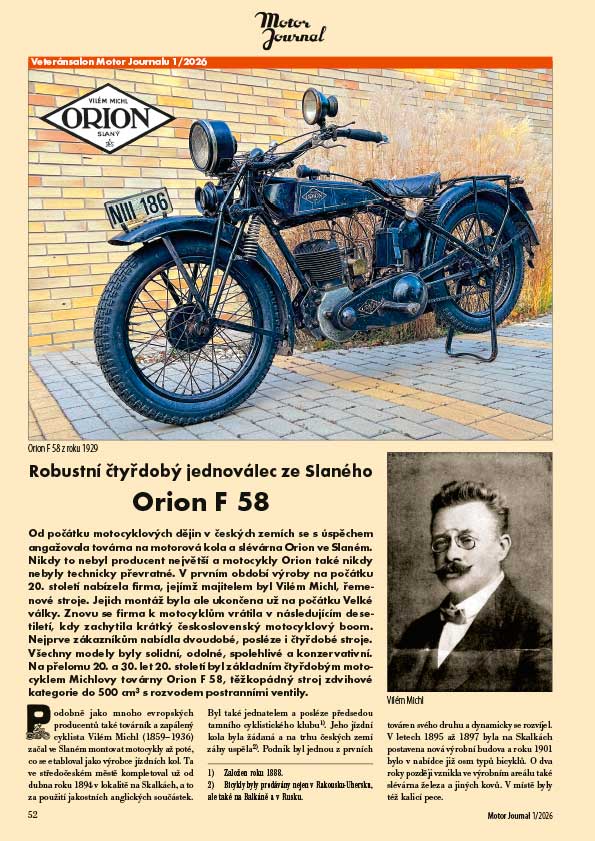 Od počátku motocyklových dějin v českých zemích se s úspěchem angažovala továrna na motorová kola a slévárna Orion ve Slaném. Nikdy to nebyl producent největší a motocykly Orion také nikdy nebyly technicky převratné. V prvním období výroby na počátku 20. století nabízela firma, jejímž majitelem byl Vilém Michl, řemenové stroje. Jejich montáž byla ale ukončena už na počátku Velké války. Znovu se firma k motocyklům vrátila v následujícím desetiletí, kdy zachytila krátký československý motocyklový boom. Nejprve zákazníkům nabídla dvoudobé, posléze i čtyřdobé stroje. Všechny modely byly solidní, odolné, spolehlivé a konzervativní. Na přelomu 20. a 30. let 20. století byl základním čtyřdobým motocyklem Michlovy továrny Orion F 58, těžkopádný stroj zdvihové kategorie do 500 cm3 s rozvodem postranními ventily.