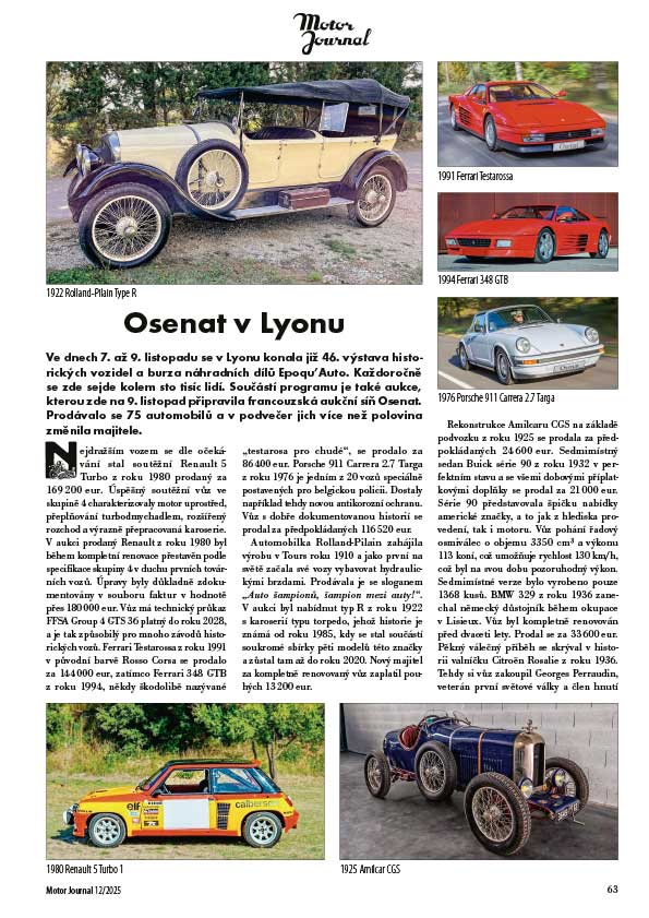Ve dnech 7. až 9. listopadu se v Lyonu konala již 46. výstava historických vozidel a burza náhradních dílů Epoqu’Auto. Každoročně se zde sejde kolem sto tisíc lidí. Součástí programu je také aukce, kterou zde na 9. listopad připravila francouzská aukční síň Osenat. Prodávalo se 75 automobilů a v podvečer jich více než polovina změnila majitele.