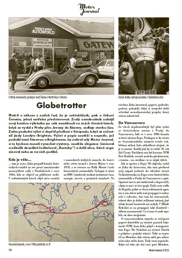 Platí‑li o někom z našich řad, že je světoběžník, pak o Jirkovi Černém, jehož netřeba představovat. Zralý osmdesátník zahájil svoji kariéru výletníka po celé zeměkouli ve svých čtrnácti letech, když se vydal z Prahy přes Jevany do Sázavy, sedlaje stovku čízu. Zatím poslední výlet si dopřál předloni v listopadu, když se zúčastnil jízdy Londýn–Brighton. Výčet a popis soutěží a expedic, jež podnikl mezi Sázavou a Brightonem, by zabral celý Motor Journal, a to bychom museli vynechat výstavy, soutěže elegance (inicioval a několik desetiletí řediteloval „Roztoky“) a další akce, které organizoval nebo se na nich podílel.