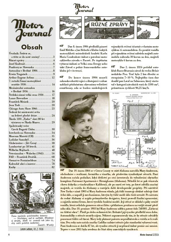 Tradičně se v rubrice Různé zprávy hlavně věnuje kulatým únorovým výročím s datem končícím šestkou. Připomínáme si osobnosti, závody, autosalony, novinky a nové knihy.