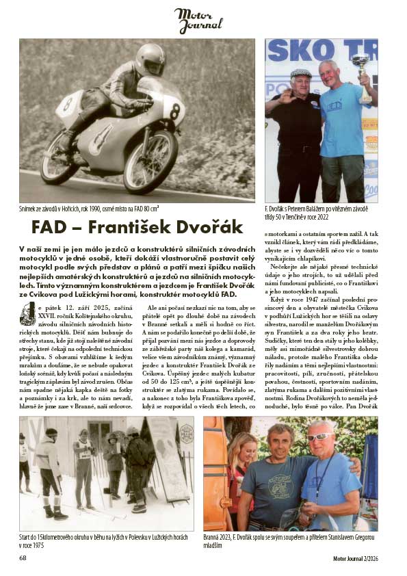 V naší zemi je jen málo jezdců a konstruktérů silničních závodních motocyklů v jedné osobě, kteří dokáží vlastnoručně postavit celý motocykl podle svých představ a plánů a patří mezi špičku našich nejlepších amatérských konstruktérů a jezdců na silničních motocyklech. Tímto významným konstruktérem a jezdcem je František Dvořák ze Cvikova pod Lužickými horami, konstruktér motocyklů FAD.