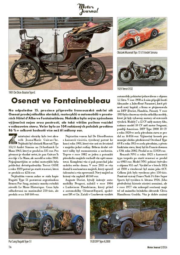 Na odpoledne 15. prosince připravila francouzská aukční síň Osenat prodej několika obrázků, motocyklů a automobilů v prostorách Hôtel d’Albe ve Fontainebleau. Nabídka byla svým způsobem výjimečná nejen svou pestrostí, ale také větším počtem vozidel v nálezovém stavu. Večer bylo ze 104 nabízených položek prodáno 86 % v celkové hodnotě více než tři miliony eur.
