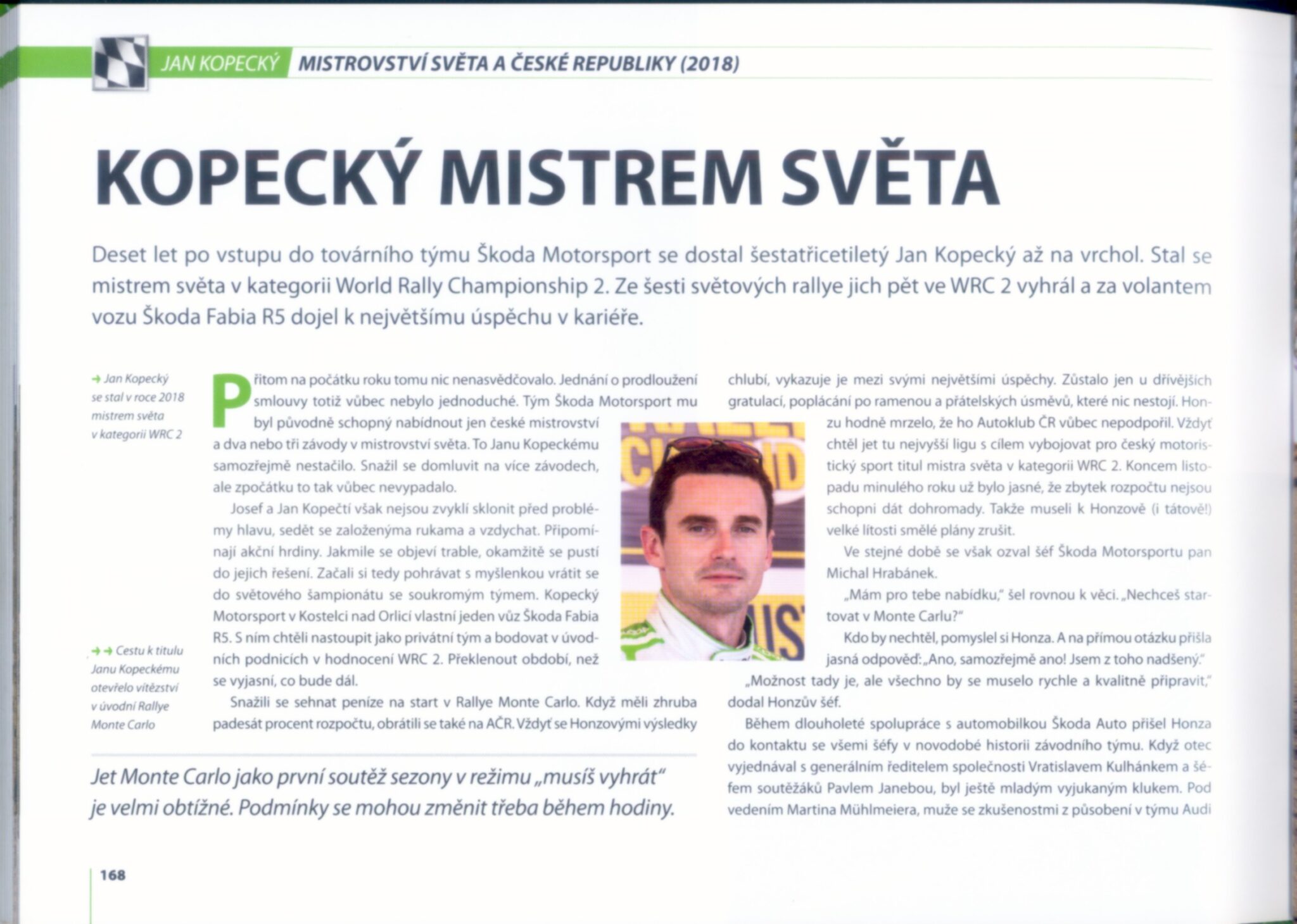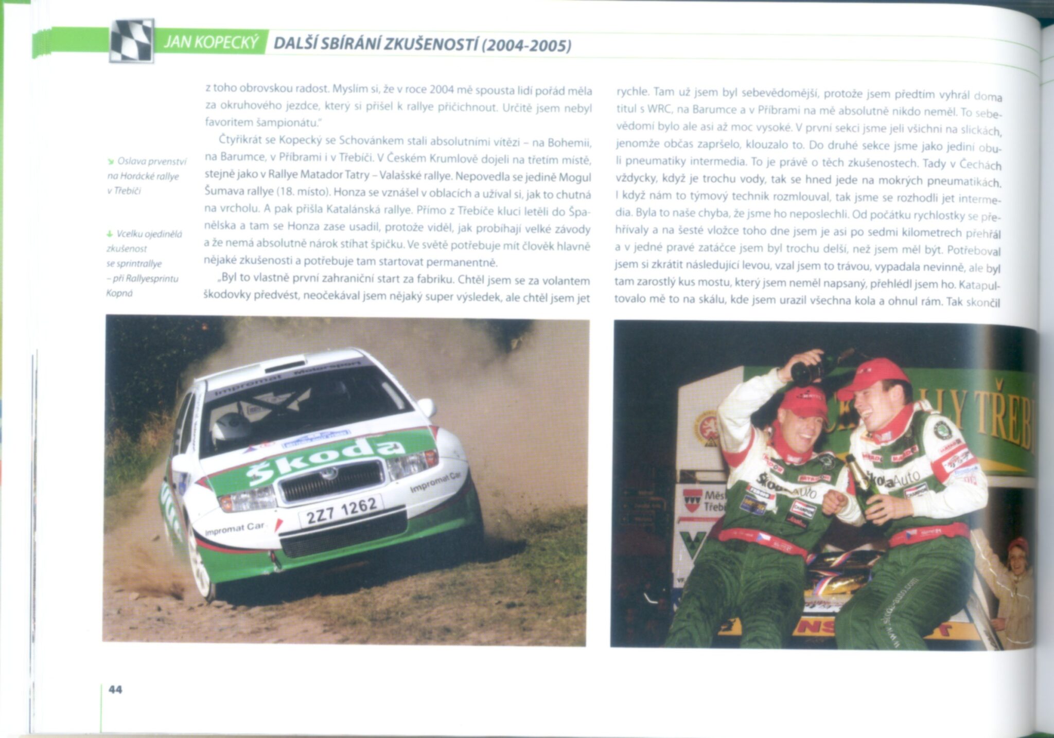 Automobilový závodník Jan Kopecký dosáhl v letošním roce výjimečného úspěchu – stal se mistrem světa v rallye. Při této příležitosti vychází kniha z pera zkušeného motoristického publicisty Petra Dufka. Podrobně mapuje dvacetiletou kariéru v současnosti nejlepšího českého automobilového jezdce, úzce spjatého se značkou Škoda.